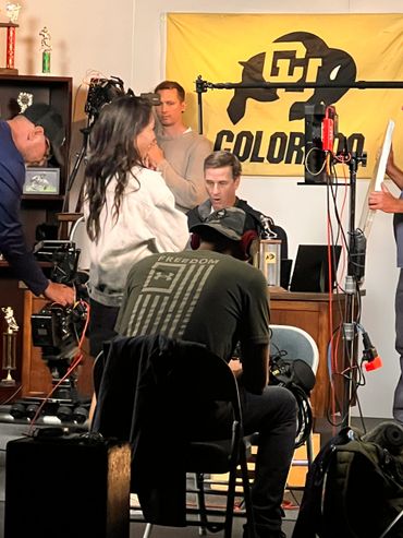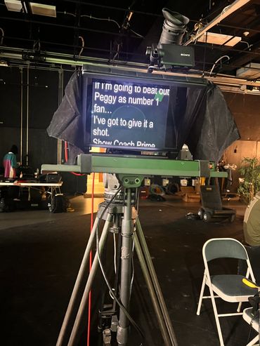 This monitor mounts on media cameras to allow the speaker to read while looking directly into the lens.